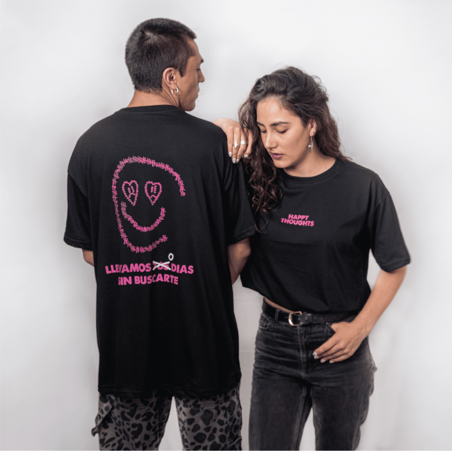 Esta prenda se inspira en los letreros de seguridad de las empresas, aquellos que registran los días sin accidentes. Si prestas atención, verás que 765 marcas conforman lo que debería ser el logo de Happy Thoughts. Sin embargo, como en el amor, los accidentes pasan.